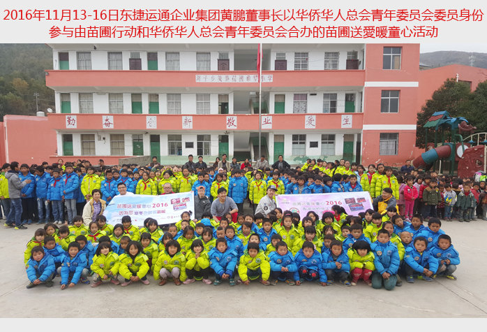 2016年11月13-16日東捷運(yùn)通企業(yè)集團(tuán)黃鵬董事長(zhǎng)以華僑華人總會(huì)青年委員會(huì)委員身份參與由苗圃行動(dòng)和華僑華人總會(huì)青年委員會(huì)合辦的苗圃送愛(ài)暖童心活動(dòng),飛往四川宜賓,再轉(zhuǎn)乘五個(gè)小時(shí)崎嶇山路到達(dá)云南省彝良縣海子鎮(zhèn)美泰苗圃希望小學(xué)和新?tīng)I(yíng)村天威苗圃希望小學(xué)的學(xué)童送去一千五百件,由華僑華人總會(huì)青委委員捐贈(zèng)的一千五百件棉衣過(guò)冬。我們將我們的愛(ài)送到山區(qū).送到有需要的孩童手上.